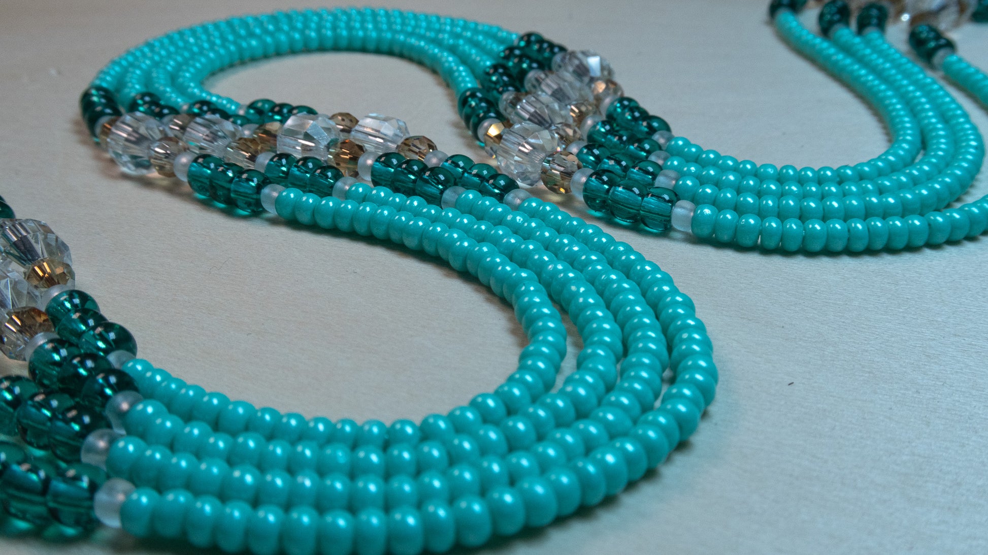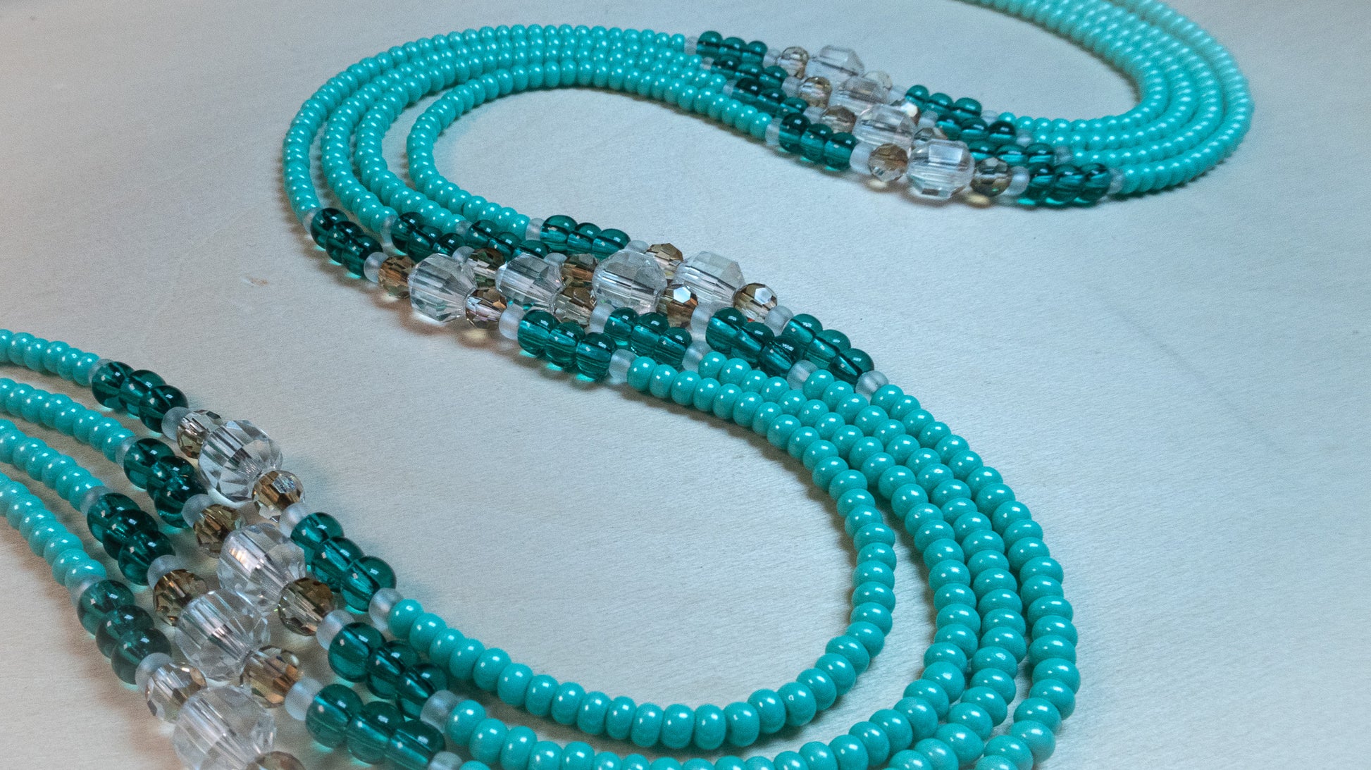 Each color in this strand's intricate pattern contributes to the piece's unique energy: seafoam green and teal for renewal as well as balance and tranquility, light topaz and matte clear for clarity and purity, and clear quartz gemstones symbolizing amplified intuition and clarity.