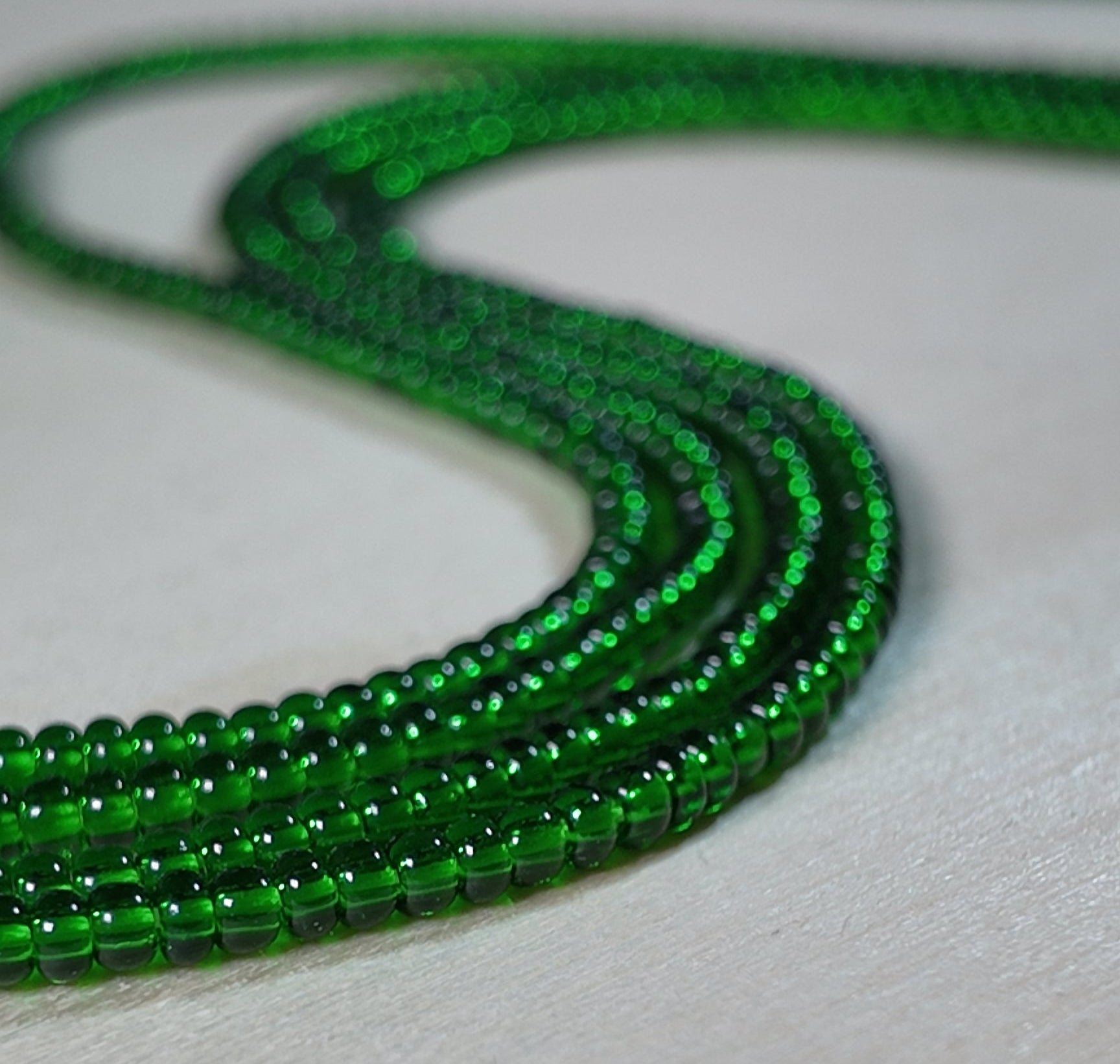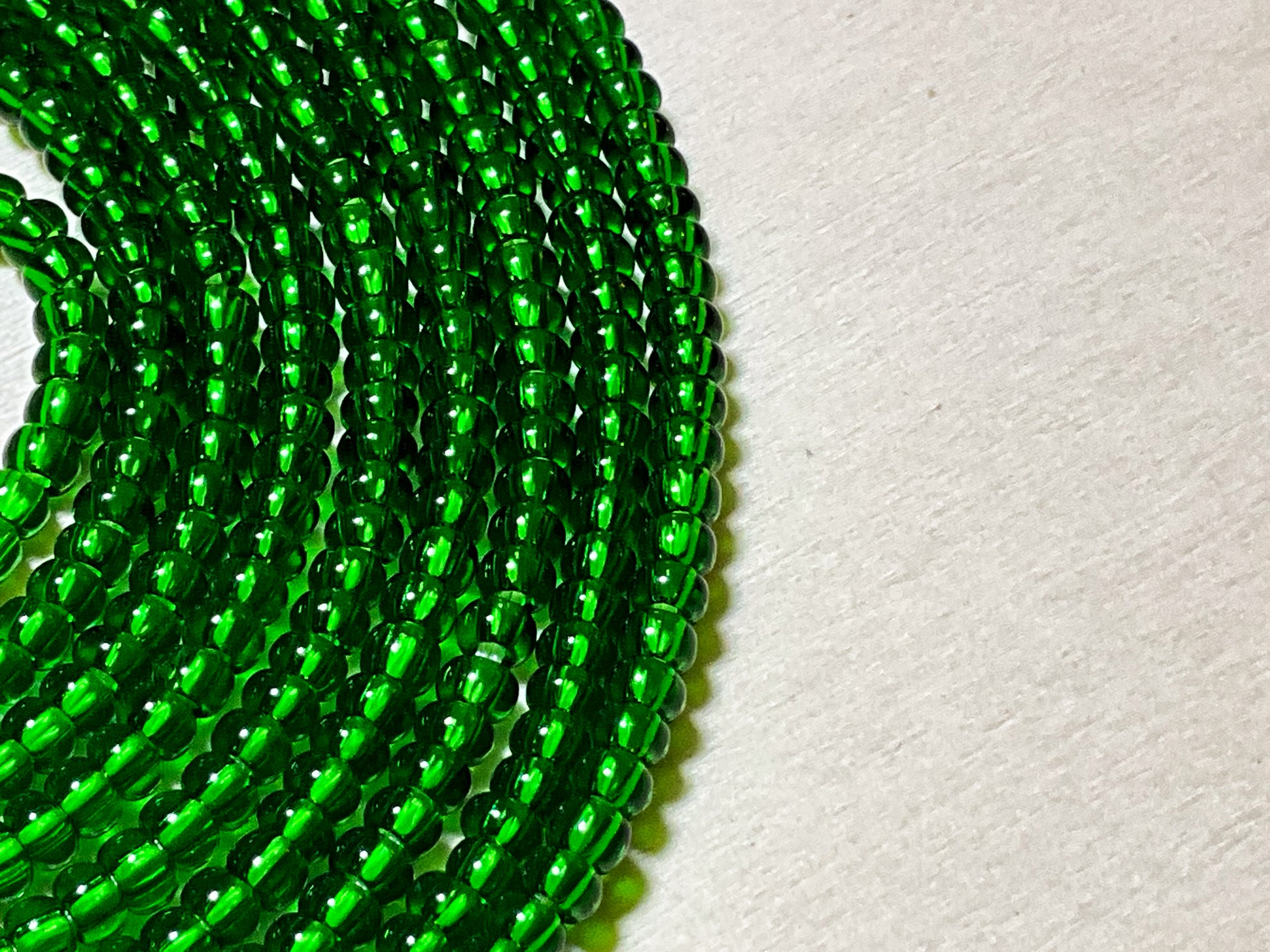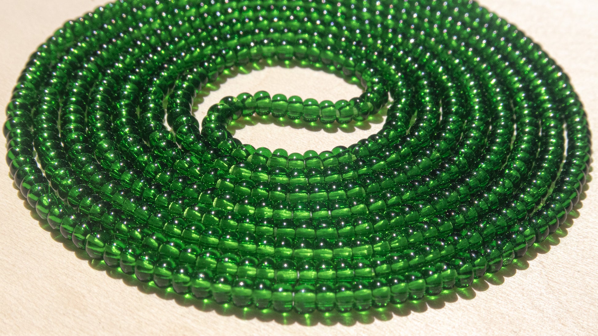 This traditional tie-on waistbead features transparent green glass seed beads representing inner peace.