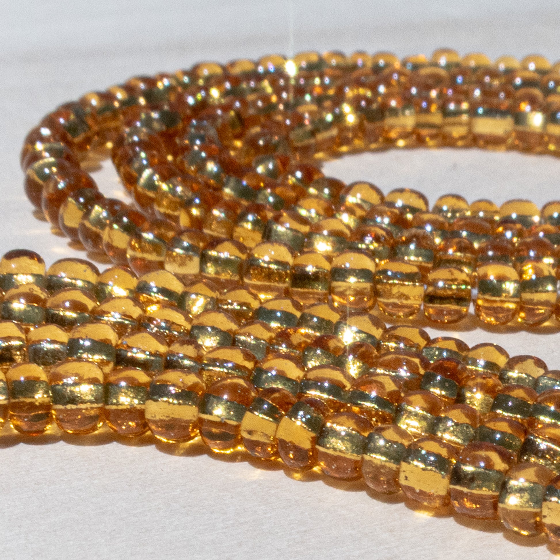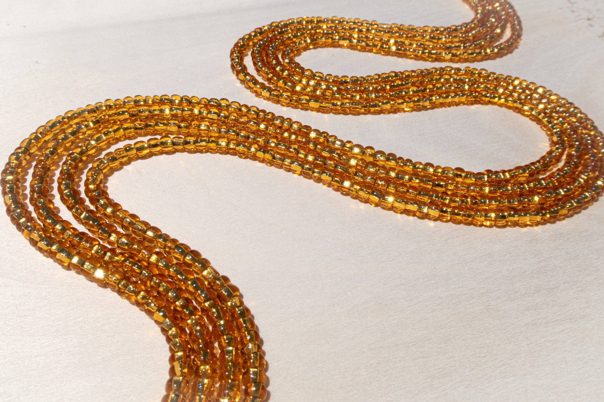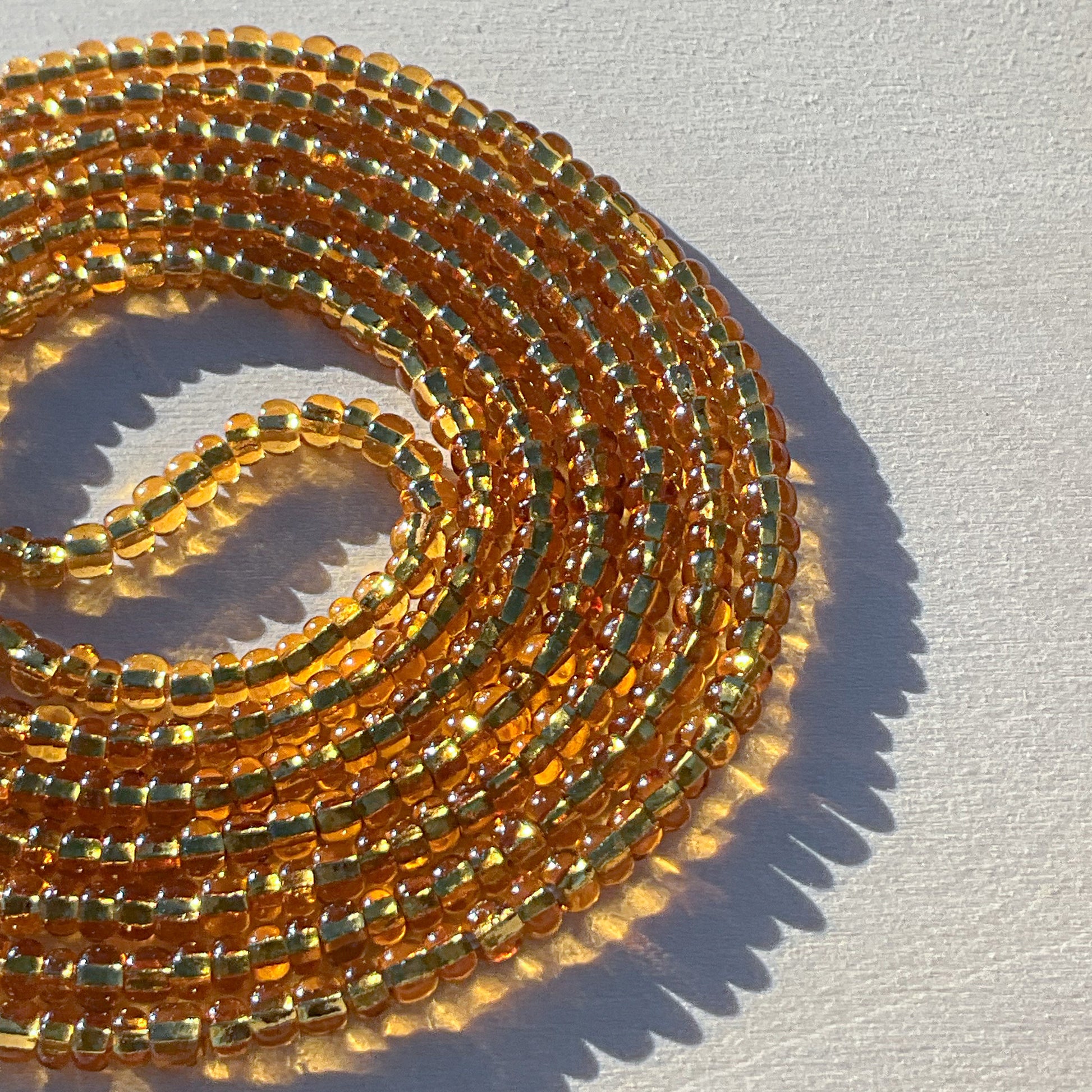 The silver-lined topaz beads handcrafted onto this traditional tie-on waistbead evoke a golden honey hue, shimmering with the warmth of pure gold when caught in the light. This radiant color is a symbol of the priceless qualities that make you who you are.