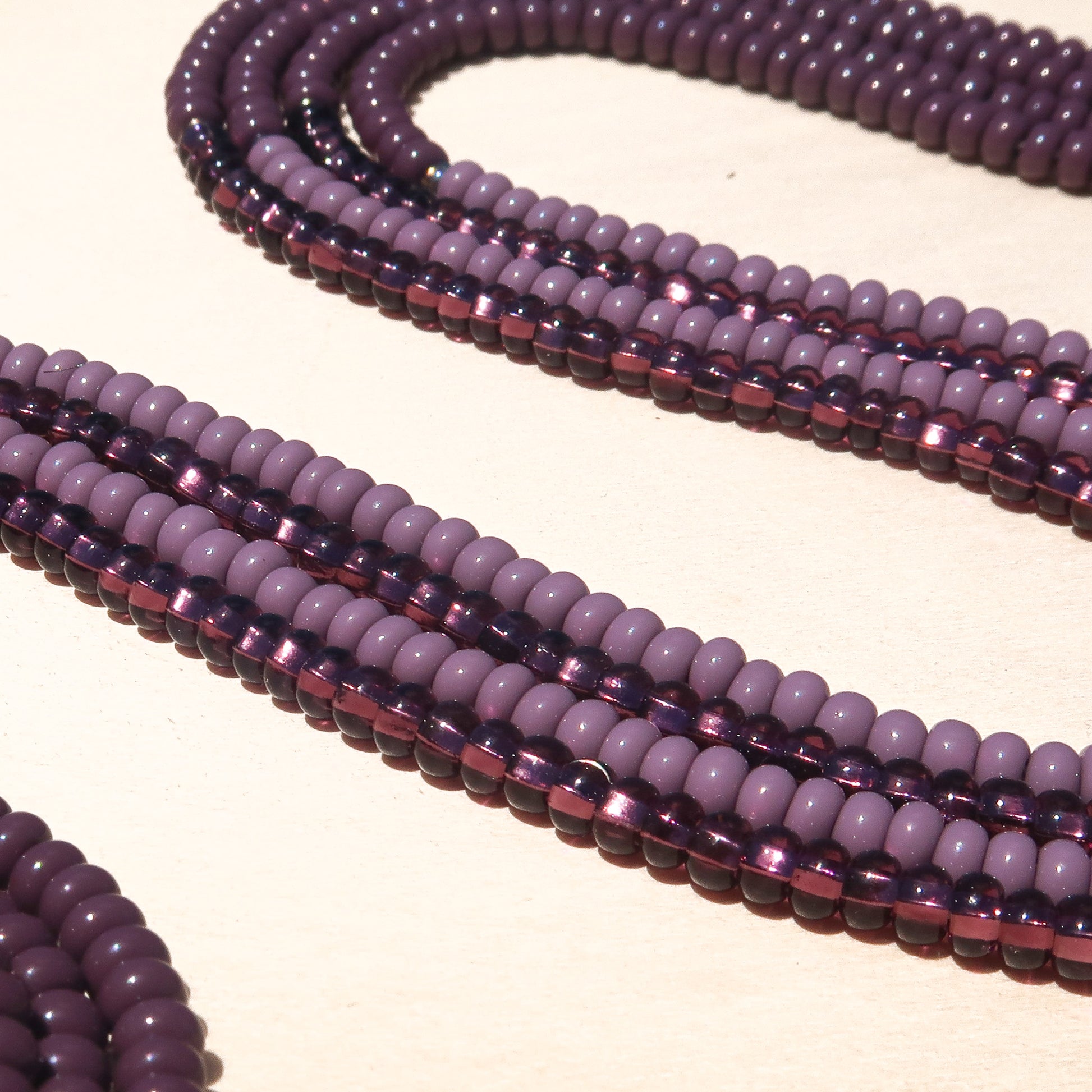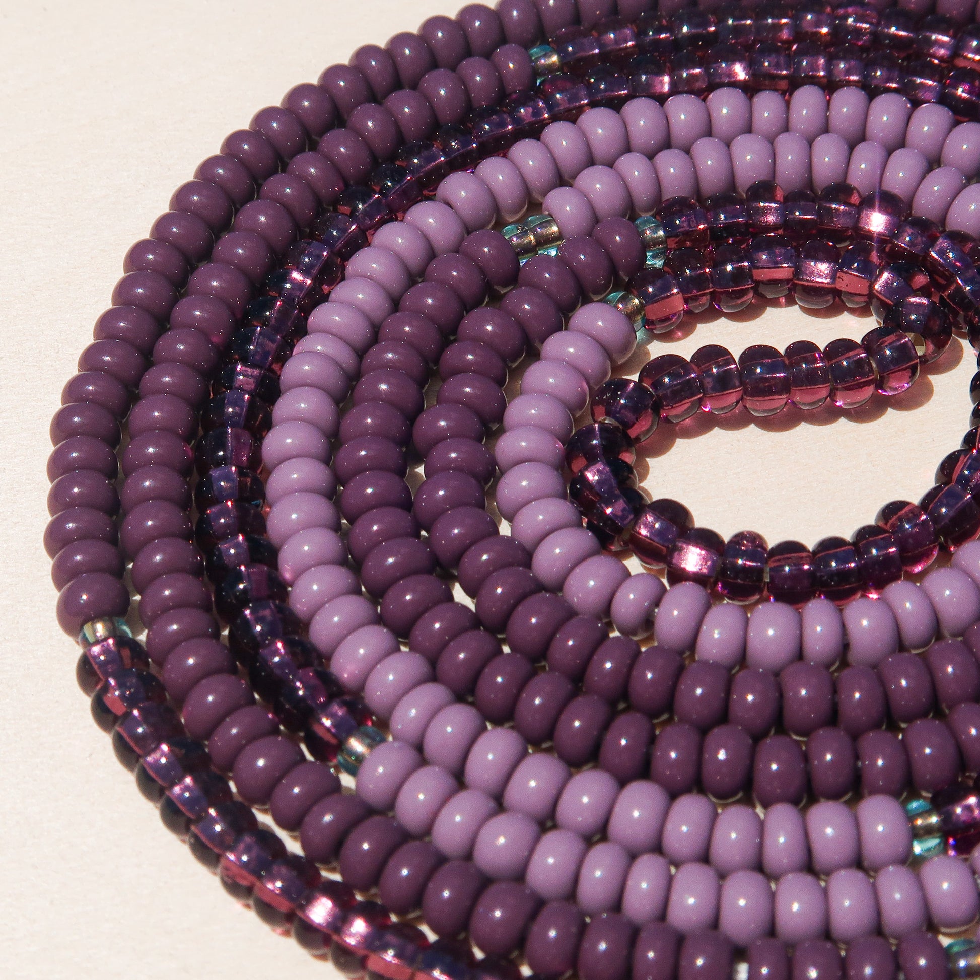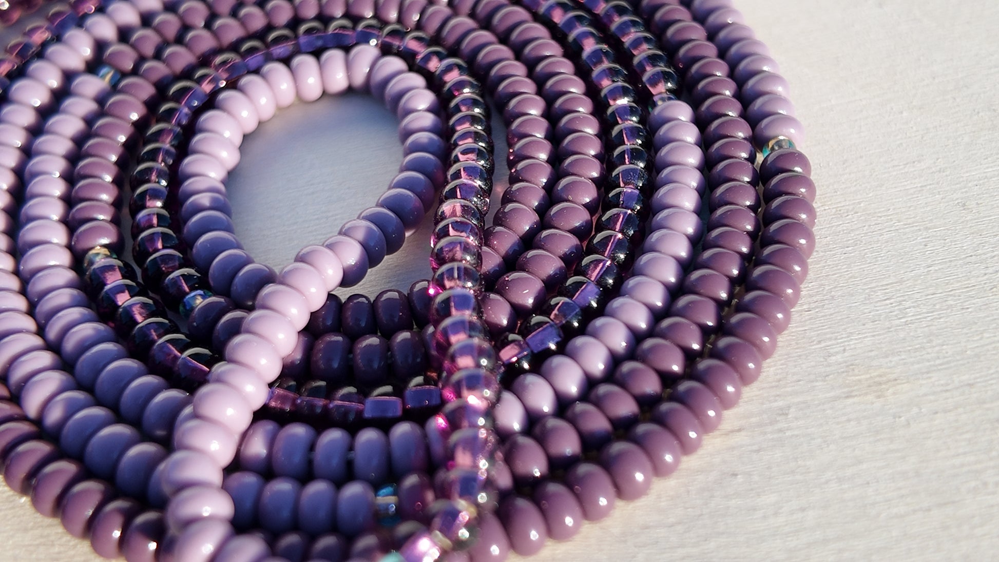 This traditional tie-on waistbead features a mesmerizing combination of purple, mauve, and silver-lined amethyst beads handcrafted in a poised pattern of elegance and sophistication.
