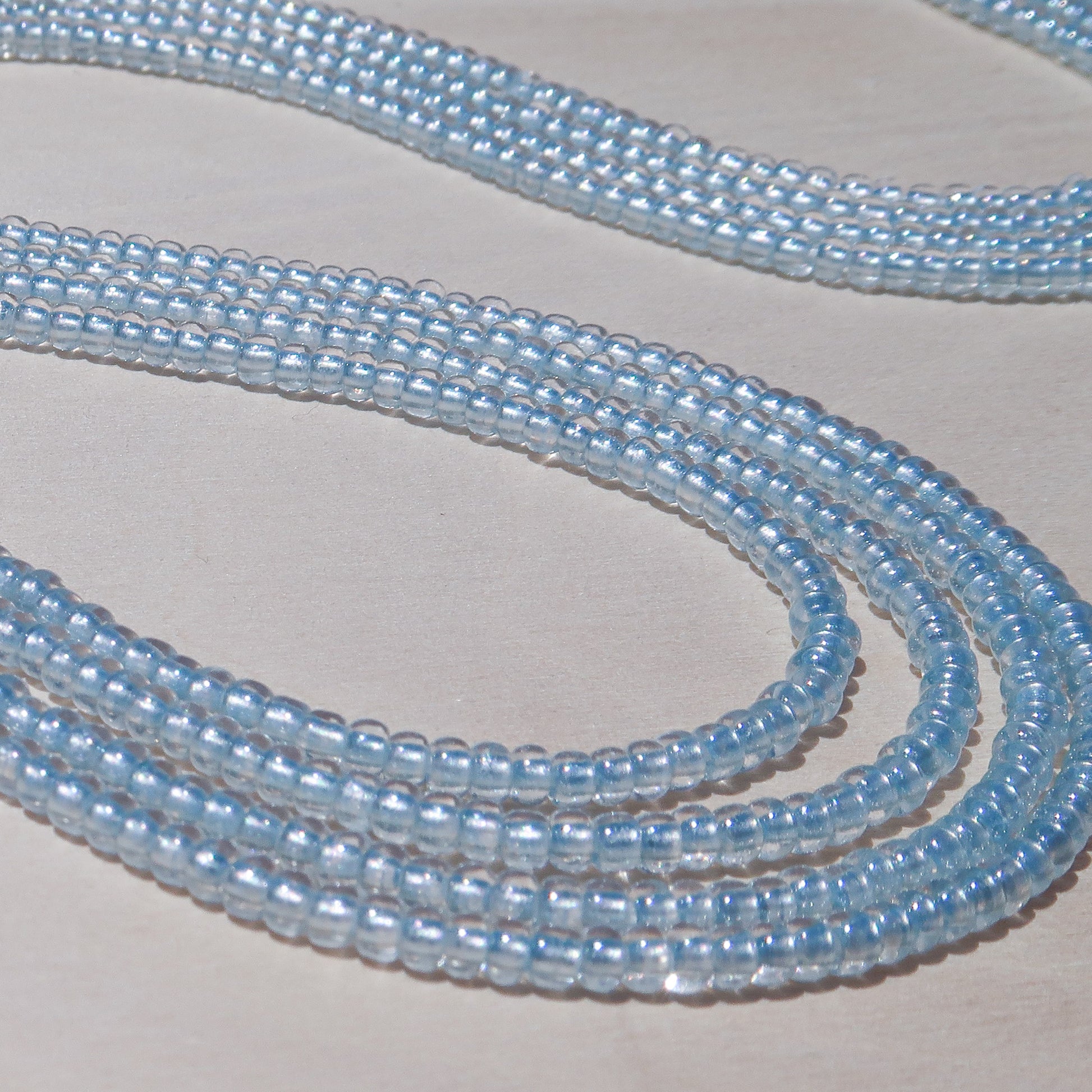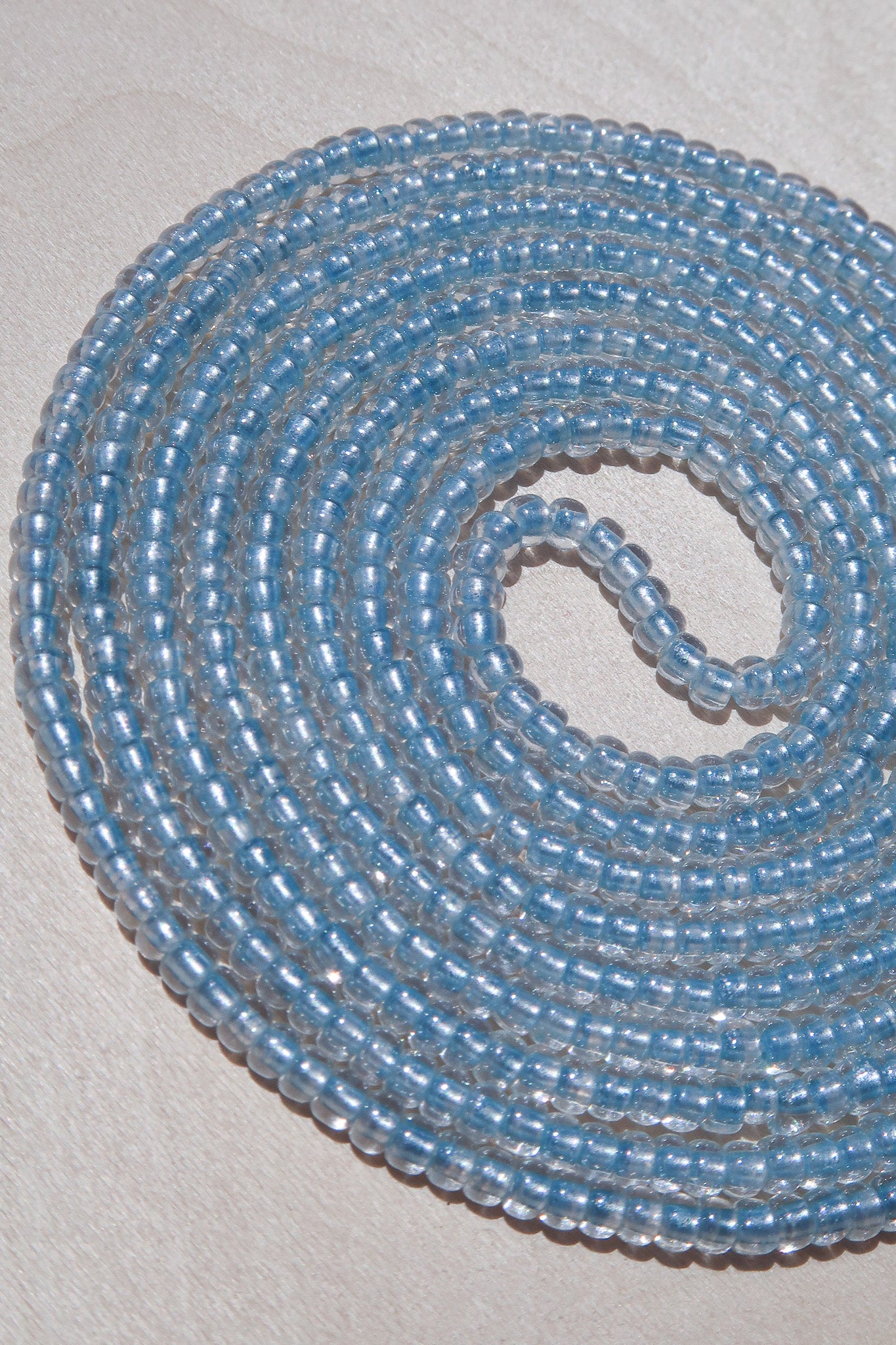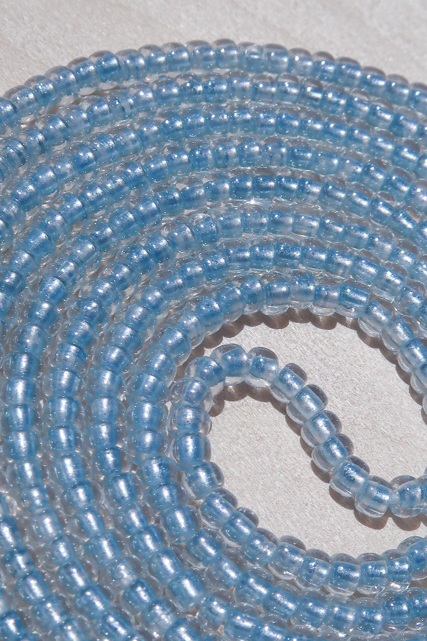 This traditional tie-on waistbead embodies the essence of remaining cool, calm, and collected. Crafted with translucent color-lined pastel blue glass seed beads, this piece is a visual whisper of serenity, inviting you to find and maintain your center amidst the chaos of life.