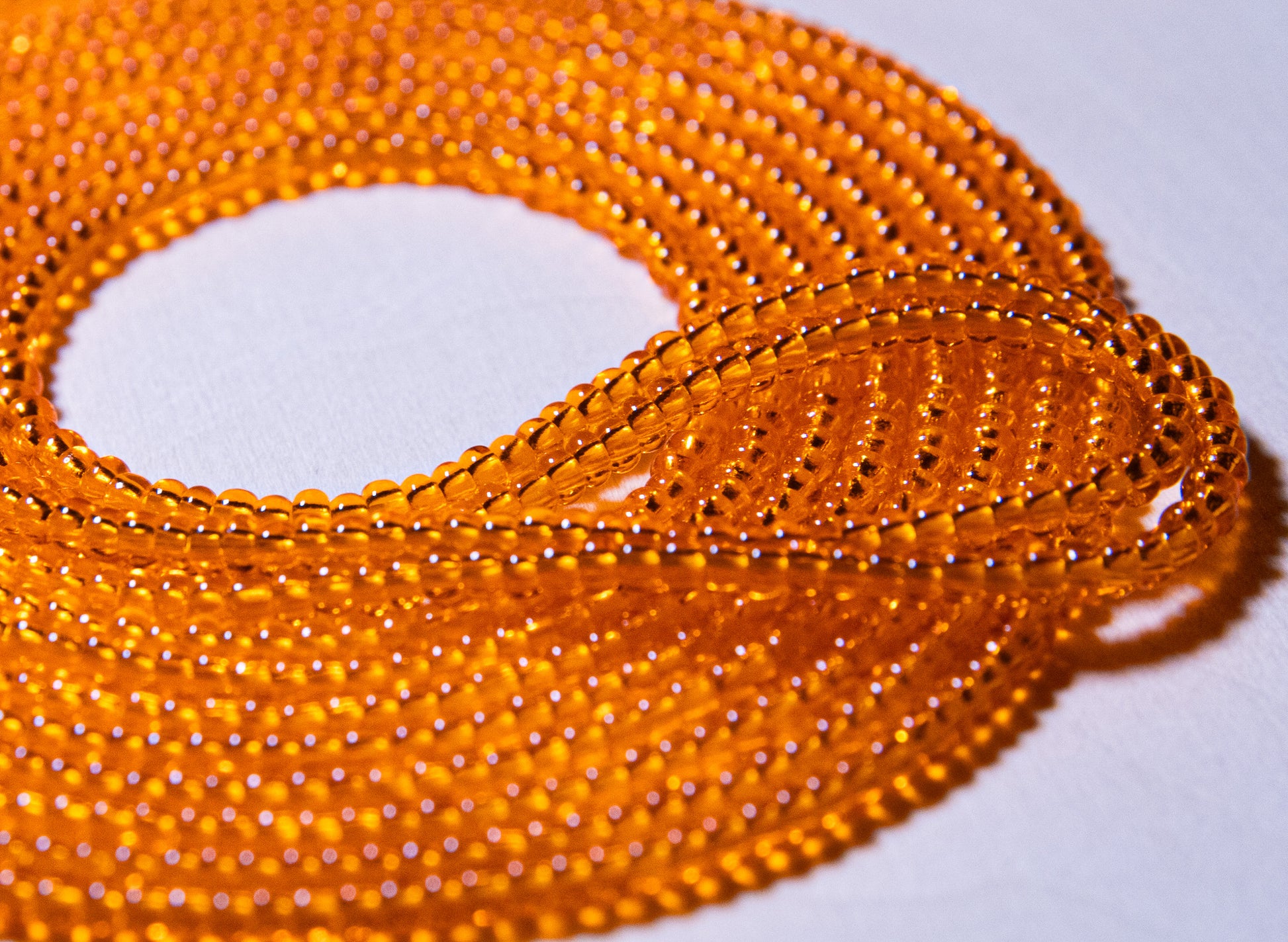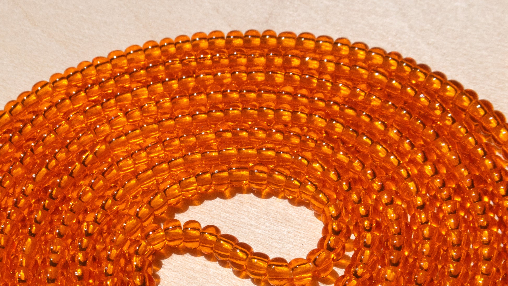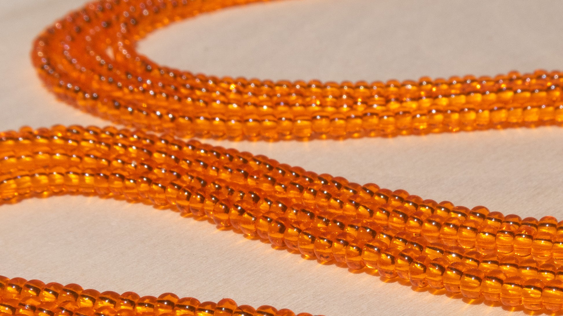 This traditional tie-on waistbead features transparent orange glass seed beads. In the realm of color psychology, orange evokes stimulation by being energetic, optimistic, warm, confident, and exuding joy. It is a color that commands attention.